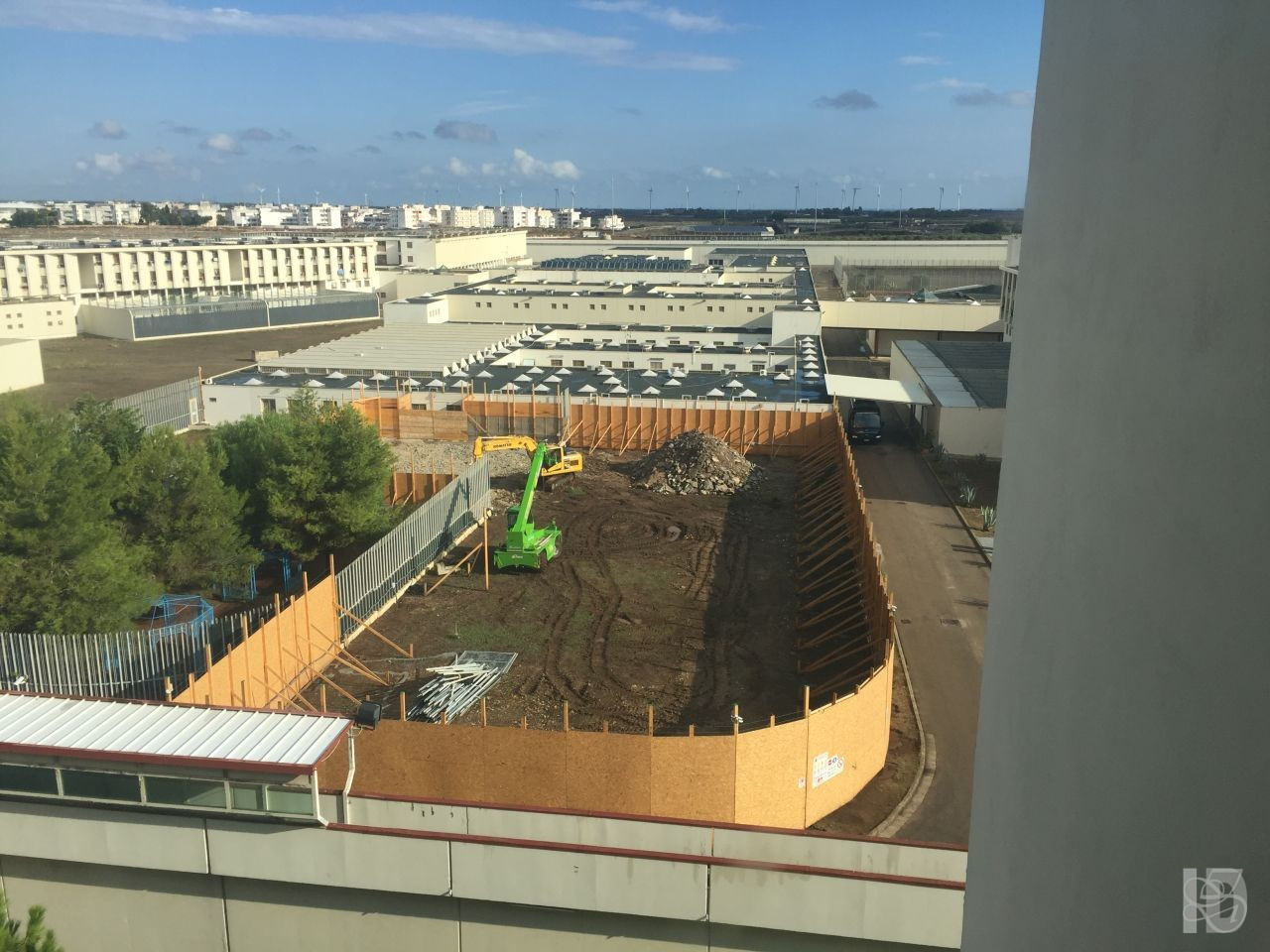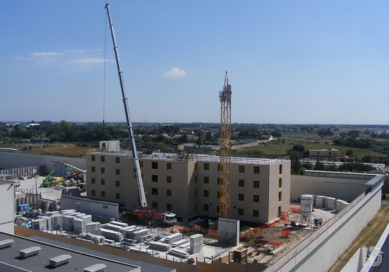 Descrizione dei lavori: Il progetto riguarda l’ampliamento della Casa Circondariale e di Reclusione di Lecce, mediante la costruzione di nuovo padiglione detentivo. Il nuovo fabbricato è interamente realizzato con il sistema della prefabbricazione, setti portanti, solai alveolari e bagni prefabbricati. Si articola in altezza in un numero complessivo di sei piani di cui cinque fuori terra ed uno interrato; in pianta, invece, si sviluppa con forma rettangolare, blocco centrale adibito a servizi e due ali laterali simmetriche adibite a spazi propri della vita detentiva. La costruzione è completata dalla realizzazione di cortili passeggio per i detenuti.