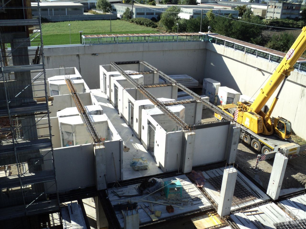 Descrizione dei lavori: Il progetto riguarda l’ampliamento presso la Casa Circondariale di Voghera, mediante la costruzione di nuovo padiglione detentivo. Il nuovo fabbricato è interamente realizzato con il sistema della prefabbricazione, travi e pilastri e bagni prefabbricati. Si articola in altezza in un numero complessivo di cinque piani fuori terra; in pianta, invece, si sviluppa con forma rettangolare, blocco centrale adibito a servizi e due ali laterali simmetriche adibite a spazi propri della vita detentiva. La costruzione è completata dalla realizzazione di cortili passeggio per i detenuti e dalle opere complementari relative alla realizzazione di :